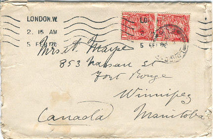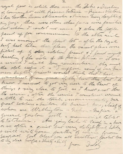 I suppose you will be just about finished or just at your breakfast & I am sitting by a window overlooking "Picadilly (after having had a rather good dinner) to write a few lines to you & send you & the kiddies a few more picture post cards I do hope that you receive them all - & that the submarines do not get them, things are getting kind of serious now, are they not? - let's hope that the U.S.A. take their stand with us & help us to "chain & muzzle the Beast of Russianism." This morning I went to see St Paul's & attended the service - again I can only say it was beautiful - impressive, inspiring & solemn - the music was great I sat right under the vast dome - the sermon was a masterpiece, by the Bishop of London he spoke from the Text in Revn "And God shall wipe a way all tears from their eyes etc" A word of glorious hope for the Future & a word of sweetest comfort in the present points (1) The use of sorrow etc = "to make perfect" II Those who mourn able to comfort others. III Another result of Sorrow etc [?] After the service I passed into the choir channel for the Communion Service, & I sat or knelt right opposite the royal pew in which there were the Duke & Duchess of Connaught with Princess Patricia - Princess Victoria & her Mother Queen Alexander & Princess Mary daughter of King George, there were others whose faces were familiar but whom I could not name, & when the people passed up for communion to the alter rail I was amongst the first lot - after the Royal Party had taken their places, the vacant places were filled up by any soldiers present, & I found myself kneeling by the side of the Princess Patricia - it was a service I shall long remember, they used the old cups etc = I suppose some of our Emerson Baptists friends would think that I had wandered from grace if they heard this, but I do know I seemed to get very near the heart of things & very close to God, as I knelt & sat thro the services, after the service I wandered arround a little to see the tombs & monuments, our great soldiers & sailors lie burried here, chief of whom are Wellington - Nelson - Napier & General Gordon with a memorial tablet to Kitchener. Am going back to Camp in a hour or so after a quiet but delightful holiday & will write you further of course from Seaford. God bless you all sweetheart, fondest love to my dear wife & Shirley & Billy