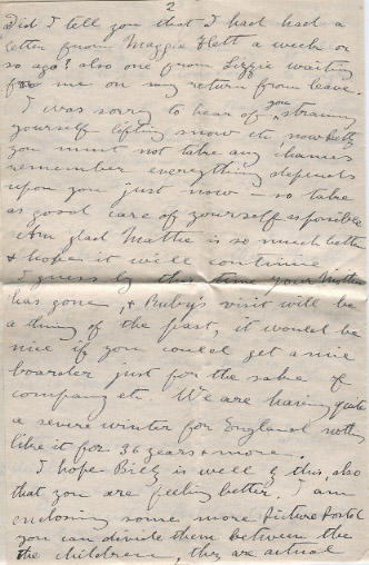 Am glad Mattie is so much better & hope it will continue. I guess by this time your Mother has gone, & Ruby's visit will be a thing of the past, it would be nice if you could get a nice boarder just for the sake of company etc. We are having quite a severe winter for England nothing like it for 36 years & more.