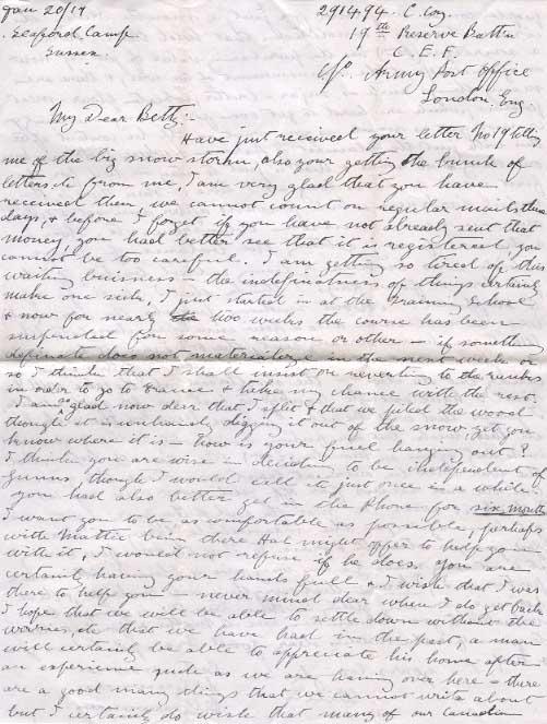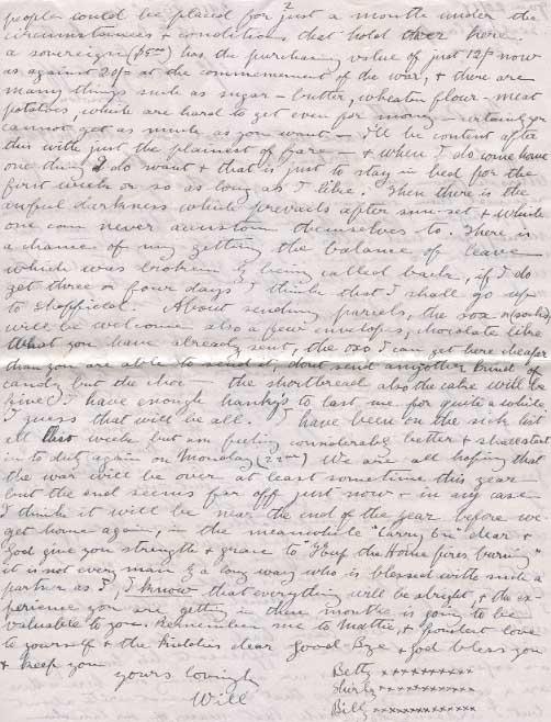 I am so glad now dear that I split & that we piled the wood though it is unhandy digging it out of the snow, yet you know where it is - how is your fuel hanging out? I think you are wise in deciding to be independant of Gunns, though I would call etc just once in a while. you had also better get in the Phone for six months I want you to be as comfortable as possible , perhaps with Mattie being there Hal might offer to help you with it, I would not refuse if he does. You are certainly having your hands full & I wish that I was there to help you - never mind dear when I do get back I hope that we will be able to settle down without the worries, etc that we have had in the past, a man will certainly be able to appreciate his home after an experience such as we are having over here = there are a good many things that we cannot write about but I certainly do wish that many of our Canadian people could be placed for just a month under the circumstances & conditions that hold over here. a sovereign ($5ºº) has the purchasing value of just 12/=now as against 20/= at the commencement of the war, & there are many things such as sugar - butter, wheaten flour - meat potatoes, which are hard to get even for money - certainly you cannot get as much as you want - I'll be content after this with just the plainest of fare - & when I do come home one thing I do want & that is just to stay in bed for the first week or so as long as I like. Then there is the awful darkness which prevails after sun-set & which one can never accustom themselves to. There is a chance of my getting the balance of leave which was broken by being called back, if I do get three of four days I think that I shall go up to Sheffield. About sending parcels, the sox of (socks) will be welcome also a few envelopes, chocolate like that you have already sent , the oxo I can get here cheaper than you are able to send it, don't send anyother kind of candy but the choc - the shortbread also the cake will be fine I have enough hanky's to last me for quite a while I guess that will be all. I have been on the sick list all this week, but am feeling considerably better & shall start in to duty again on Monday (22nd) We are all hoping that the war will be over at least sometime this year but the end seems far off just now - in any case I think it will be near the end of the year before we get home again, in the meanwhile "Carry On" dear & God give you strength & grace to "Keep the Home fires burning" it is not every man by a long way who is blessed with such a partner as I, I know that everything will be alright, & the experience you are getting in these months is going to be valuable to you. Remember me to Mattie, & fondest love to yourself & the kiddies dear Good-Bye & God bless you & keep you
