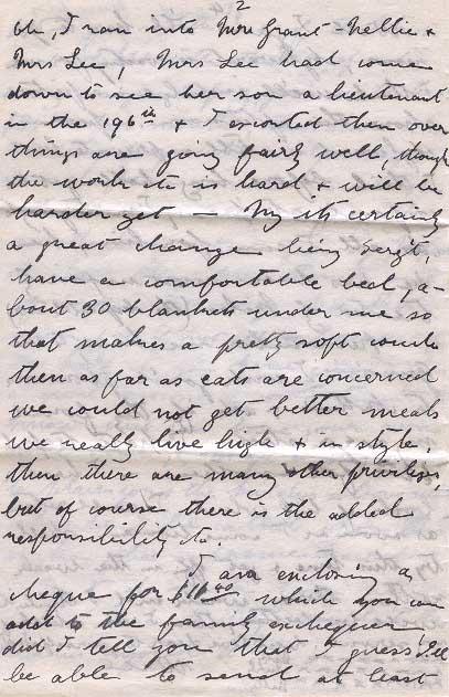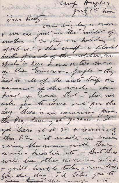 One big day is over & we are just in the midst of another - To day is a holiday sports etc & the camp is flooded with friends of the soldiers, Mrs. Spick is here & one or two more of the Emerson people - they had to call off the auto trip on account of the roads. Am kind of sorry that I did not ask you to come out for the day, there is an excursion from the ‘Reg leaving at 7-30 am & it got here at 10-30 & leaves early this P.M. - it made me lonely seeing the men with their wives & kiddies etc - But there will be other excursions later on & you'll have to take a run down for the day I'd like you to see the camp etc. Oh, I ran into Mrs. Grant - Nellie & Mrs. Lee, Mrs. Lee had come down to see her son a lieutenant in the 196th & I escorted them over things are going fairly well, though the work etc is hard & will be harder yet - My its certainly a great change being Serg't have a comfortable bed, about 30 blankets under me so that makes a pretty soft couch then as far as eats are concerned we could not get better meals we really live high & in style, then there are many other privileges, but of course there is the added responsibility etc.