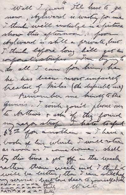 My I do wish you had been here to day wouldn't the kiddies enjoyed it? Well I guess I'll have to go now, Aylward is waiting for me I think we'll indulge in a picture show this afternoon, poor Aylward is still a private, but I think before long he'll get his corporal's stripes, I'm trying to do all I can for him, he he has been most unfairly treated by Miles (the despicable [?])