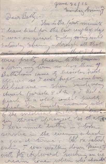 This is the first minute I have had for the last couple of days I was on guard Friday evening until Saturday Evening - through all that rain - then the men that I had were pretty green to the business & during my term no less than 7 Battalions came by besides Field Officers so I was kept some busy believe me - Then Sunday morning church parade 8 A.M. & I had a peach of a cold could hardly speak on Sunday morning, went to the medical orderly & had my throat sprayed so that I was much better - I took service in the evening & had a good time, Oh on Saturday evening I was walking down Maine St with Pte Aylward sucking an ice cream cone when who should I meet but Mrs. Coad she was with two other nurses she stopped for a minute to shake hands etc.