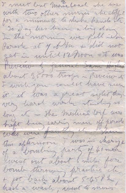 To day has been a big day In the morning we fell in on Parade at 7 A.M. & did not get in until 12 Noon = It was Review by General Sam Hughes about 35,000 troops in Review etc I wish you could have seen it it was a great sight, though very hard work standing so long etc - The Medical Corps were kept busy carrying men off parade who were fainting etc. Then this afternoon I was in charge of a bombing party of 40 men went out about 6 miles for bomb throwing practice etc, & got back about 5-45 P.M., had a wash, went to mess then sat down to write this letter.