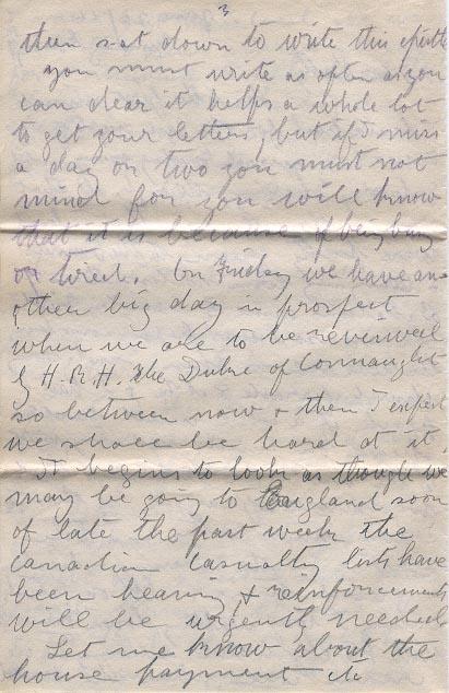 You must write as often as you can dear it helps a whole lot to get your letters, but if I miss a day or two you must not mind for you will know that it is because of being busy or tired. On Friday we have another big day in prospect when we are able to be reviewed by H.R.H. the Duke of Connaught so between now & then I expect we shall be hard at it.