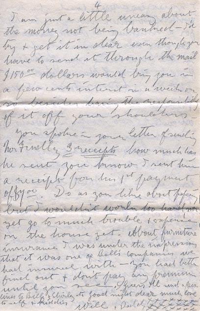 You spoke in your letter of sending Mr. Findlay 3 receipts how much has he sent, you know I sent him a receipt for his 1st payment of $ 7.00. Do as you like about papering but I wouldn't work to hard or nor yet go to much trouble & expense on the house yet. About furniture insurance I was under the impression that it was one of Bell's company's we had insured with - you had better find out & don't pay any premium until you see. Guess I'll send a few lines to Billy & Shirley etc Good night dear much love to self & kiddies