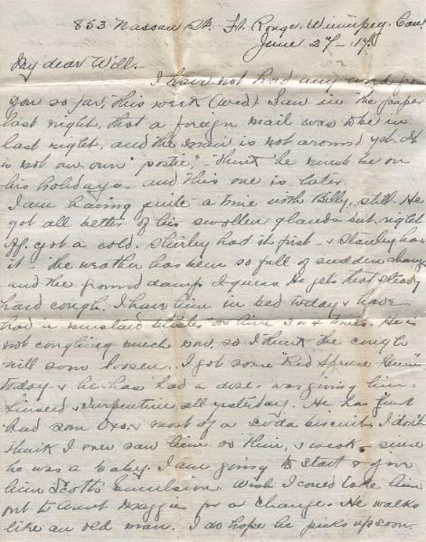 I am having quite a time with Billy still. He got all better of his swollen glands but right off got a cold. Shirley had it first - & Stanley had it - the weather has been so full of sudden haze and the ground damp I guess. He gets that steady hard cough. I have him in bed today & have had a mustard blister on him 3 or 4 times. He is not coughing much now, so I think the cough will soon loosen. I got some "Red Spruce Gum" today - & he has had a dose, was giving him Linseed & Turpentine all yesterday. He has just had some oxo & most of a soda biscuit. I don't think I ever saw him so thin & weak - since he was a baby. I am going to start & give him Scott's Emulsion. Wish I could take him out to Aunt Maggies for a change. He walks like an old man. I do hope he picks up soon. He has brightening up this last while - enough to make my go down cellar & cut the smallest block of my new cake, to get him a bit. I think he will be better by morning. After I have had the mustard on a few more times. I was thinking of phoning Dr. McRae again, but he seems to be improving.