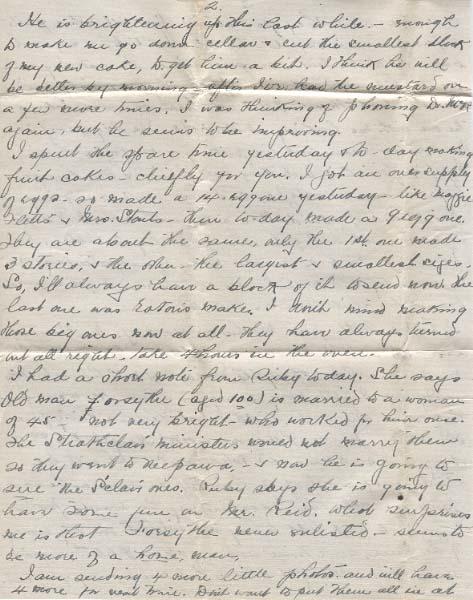 I spent the spare time yesterday & to-day making fruit cakes - chiefly for you. I got an over supply of eggs - so made a 14 egg one yesterday - like Maggie Fletts & Mrs. Stants - then to-day made a 9 egg one. They are about the same, only the 1st one made 3 stories, & the other the largest & smallest sizes. So, I'll always have a block of it to send now. The last one was Eaton's maker. I don't mind making those big ones now at all. They have always turned out all right - take 4 hours in the oven.