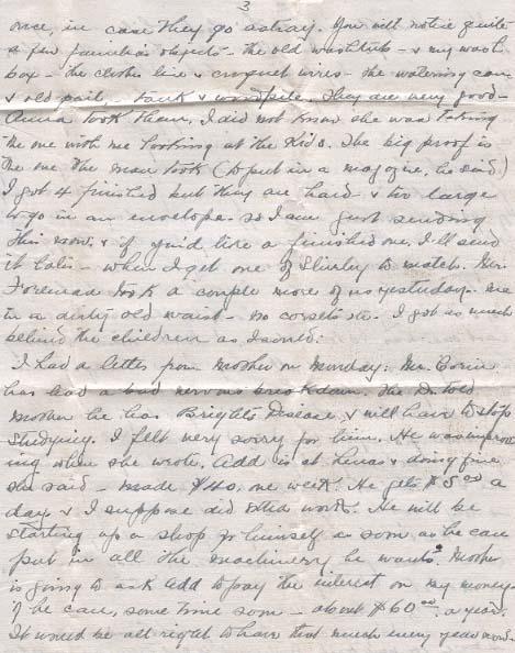 I had a letter from Mother on Monday. Mr. Corin has had a bad nervous breakdown. The Dr. told mother he has Bright's Disease, & will have to stop studying. I felt very sorry for him. He was improving when she wrote. Add is at Lena's & doing fine she said - made $40, one week. He gets $ 5.ºº a day & I suppose did extra work. He will be staring up a shop for himself as soon as he can put in all the machinery he wants. Mother is going to ask Add to pay the interest on my money if he can, some time soon - about $ 60.00 a year. It would be all right to have that much every year now.