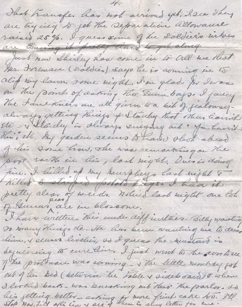 Just now Shirley has come in to tell me that Mr. Foreman (soldier) says he is coming in to clip my lawn some night, I'm glad - for I was on the point of asking the Gunn boys. I fancy the Faulkners are all given to a bit of jealousy - always getting things for Stanley that others haven't etc - & Stanley is always signing out "you haven't this", etc. My garden seems to have shot ahead of his some how, & he was remarking on the poor earth in his, last night. Ours is doing fine. I hilled up my Murphey last night - & killed to striped potato bugs. I have it pretty clear of weeds. Noticed last night one lot of Gunns peas are in blossom.