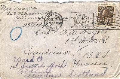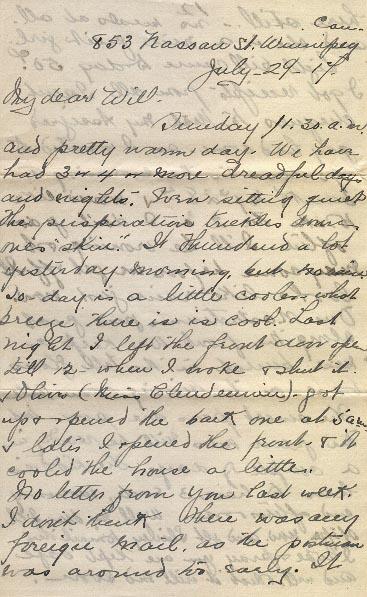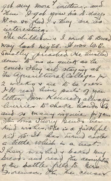 The children and I went to Broadway last night. It was W.C. Smalley preached. He hustled down to us quick as he could. They are staying at An Agriculture College for 2 weeks & are to be over. I'll read him parts of your letter. Mrs. Kennedy always hurries to shake hands too, and so many inquire for you. This time Thorey sends her kind wishes. She is a faithful kid too. It has turned cooler a little which is a treat. I have washed & baked my bread- and read the description of the battle field to Mrs. Foreman. Oh, the cousin got a stroke or two in - cut a wee hole one place taking out one word- was it Vimy? Another was stroked out - the day you were going back to the trenches - & about 2 lines in another place, I think I can find out where you are anyway.