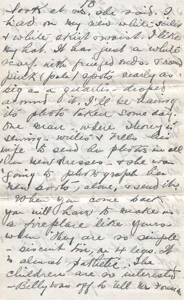 I feel so glad having had your letters to-day. Mrs. Gunn is coming over to hear part of them abut the battlefields. - when we were coming from church she called us in - to look at us she said. I had on my new white sailer & white skirt & waist. I like my hat. It was just a white scarf, with fringed ends. & round pink (pale) spots nearly as big as a quarter - dropped around it. I'll be having its photo taken some day. One man - where Thorey is sewing - writes & tells his wife to send him photos in all her new dresses - & she was ‘going to photograph her new boots, alone & send it.