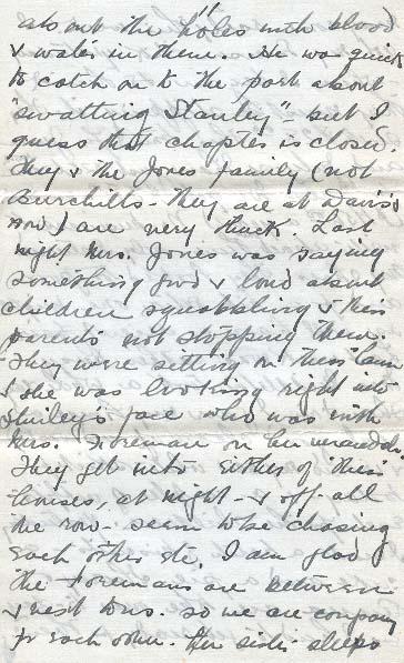 When you come back you will have to make us a fireplace like yours - when they are so simple - biscuit tin, and 4 legs. It is almost pathetic. The children are interested - Billy was off to tell Mrs. Foreman about the holes with blood & water in them. He was quick to catch on to the part about "swatting Stanley" - but I guess that chapter is closed. They & the Jones family (not Burchills - they are at Dans & now) are very thick. Last night Mrs. Jones was saying something good & loud about children squabbling & their parents not stopping them - They were sitting on their lawn & she looking right into Shirley's face who was with Mrs. Foreman on her verandah. They get into - either of "them" houses, at night - & off all the row - seem to be chasing each other, etc. I am glad the Foremans are between & next to us so we are company for each other. - her side - sleeps here still - no meals at all, and she is a nice quiet girl.
