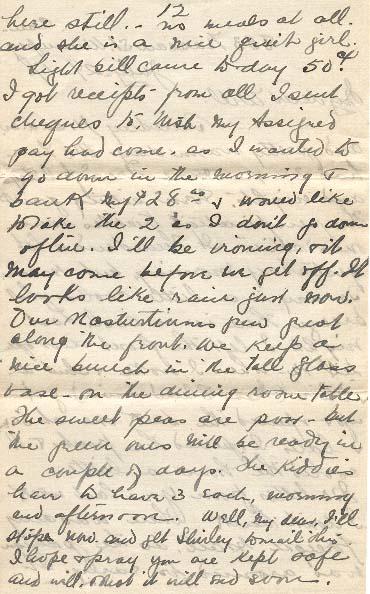 Light bill came today 50¢. I got receipts from all I sent cheques to. Wish my Assigned pay had come, as I wanted to go down in the morning & bank my $ 28.°° & would like to take the 2 as I don't go down often. I'll be ironing, & it May come before we get off. It looks like rain just now. Our Nasturtiums grew great along the front. We keep a nice bunch in the tall glass vase on the dining room table. The sweet peas are poor - but the green ones will be ready in a couple of days. The kiddies have to have 3 each, morning and afternoon. Well, my dear, I'll stop now and get Shirley to mail this. I hope & pray your are kept safe and will & that it will end soon. When Billy says grace now he always adds "and pertect dear papa, & pervide his needs this day". He use to say "give him his needs." Some times he starts up & says "Papa's coming home to-morrow, he said "so". I think he just wants you to come, so much.