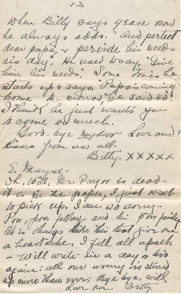 Oh, Will, Mr. Pryor is dead - it is in the paper, I just went to pick up. I am so sorry - Poor, poor fellow, - and his poor family. It is things like this that give one a heartache, I feel all upset. - Will write in a day or two again: all our worry is stirred up more than ever: Bye bye, Will