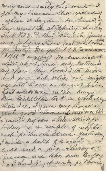 No letter from you last week. I don't think There was all Foreign Mail as the postman was around too rarly. It may come early this week. I got my Emerson chk yesterday - when I began to think They must be stopping eh. They week $28.°° this time for June and July so I have just $ 25 to come now For July. We got $ 88.°° a mo. now ($1156.°° a year) No-business to write about this time - only I returned my shoes - they looked too poor - and a bit extra one might as well have a decent pair. Last week was rather busy. Mrs. Middleton took a whole day. Then Fri I gave my house a real good clean up and washed & ironed my new white skirt for today- & a couple of outfits Each for the children. Yesterday I made a batch of biscuits - a cake and a pie. Thorey & Anna are to be over to-day so I had to get ready for them. They will likely have their Kodak along. In this I am sending 2 taken last Sunday. I have my black suit on - & I don't like it a bit - not my style.