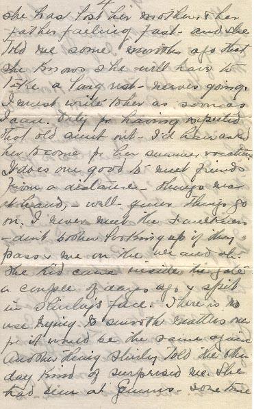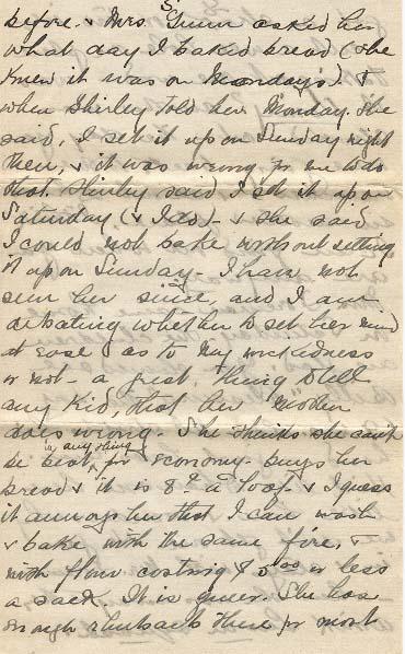 Oh - we were looking at my locket the Monday - and I found a small lock of hair in it, which revived old memories. Do you remember Hattie Caswell & me cutting of your head - at Wolfe Lake. So much has happened since then - situations we never dreamed of - the present e.g. You away at a world war - & I here with 2 kiddies the home to look after. I wonder what Hattie is doing - Since then she has lost her mother, & her father is failing fast - and she told me some months ago that she knows she will have to take a long rest - nerves going. I must write to her as soon as I can. Only for having expected that old aunt out, I'd have asked her to come for here summer vacation. It does one good to meet friends from a distance - thoug near at hand- well - given things go on. I never meet the Faulkuers - didn't bother looking up if they pass & me on the war and oh the kid came inside the gates a couple of days ago & spit in Shirley's Face. There is no use trying to smoothe matters over for it would be the same again. Another thing Shirley told the other day kind of surprised me. She had been at Gunn's - some time before Mrs. Gunn asked her what day I had I baked bread (she knew it was on Monday's) & when Shirley told her Monday she said, I set it up on Sunday night then, & it was wrong for me to do that. Shirley said I set it up on Saturday (& I do) - & she said I could not bake without setting it up on Sunday - I have not seen her since, and I am debating whether to set her mind at ease as to my wickedness or not - a great thing to tell any Kid, that her mother does wrong. She thinks she can't be beat in anything for ecomomy - buys her bread & it is 8¢ a loaf. & I guess it annoys her that I can wash & bake with the same fire, & with flour costing $ 5.°° or less a sack. It is queer. She has enough rhubarb there for most anything - & has never offered me a stick - since I came in here. Tho Miss Olive actually sold me 10¢ worth last summer. I am quite indifferent of them. She has told me 2 or 3 times lately to leave the children there while I go down street but I am glad I have not - only the day I went to the P.O. at Morley Ave. I asked Olive to come to the Park some time with the kiddies & me but she said they had a season family pass to the Beach, (from the C.N.R.) - so I guess she will not come but she wont come an invitation any way& I'd wager the family does not once go the Beach.