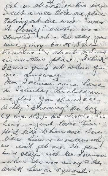 Mrs. Foreman came home on Saturday, the children are glad. You should see Billy "blessing" the boy (9 mo. old) - He strokes his head.- just loves him. He'd like to have one here like him & wonders why we don't get one. He goes in & stays with Mr. Foreman - when she was away & they drink lemon squash.