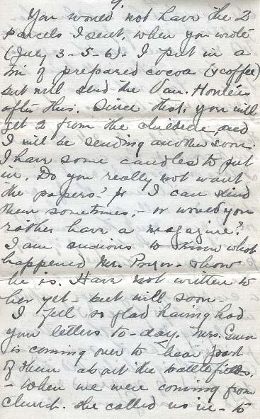 You would not have the two parcels I sent, when you wrote (July 3-5-6). I put in a tin of prepared cocoa (& coffee) but will send the Van. Honlèu after this. Since that, you will get 2 from the children and I will be sending another soon. I have some candles to put in. Do you really not want the papers? for I can send them sometimes, - or would you rather have a magazine? I am anxious to know what happened Mr. Pryor. & how he is. Have not written to her yet- but will soon -