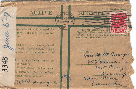 Just a line or two before mailing this letter, its evening & it is refreshing to sit out among the trees after the awful heat of the day, for it is far hotter than we ever get it in Canada - The guns are booming all arround & most likely a little later on things will get a little more lively they generally do at night, I have not met any of the Emerson boys yet, but expect to see them any time now. I am going for a walk to the cemetery there are two right close by hundreds of graves mostly French soldiers - little forests of wooden crosses, with helmets etc on top of the mound - it looks pathetic etc, My address will be, Cpl Mayse 291494, 1st C.M.R. Canadians B.E.F. France - Remember me to Gunns etc etc Again God bless you , "Bon Buit Mon Cherrie" fondest love