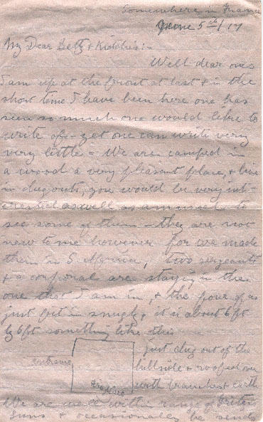 Well dear ones I am up at the front at last & in the short time I have been here one has seen so much one would like to write of - yet one can write very very little = We are camped in a wood a very pleasant place, & live in dugouts, you would be very interested as well as amused to see some of them - they are not new to me however for we made them in S. Africa, two sergeants & a corporal are staying in the one that I am in, & the four of us just fit snugly, it is about 6 ft by 6 ft something like this [drawing] just dug out of the [?] & roofed over with braches & earth