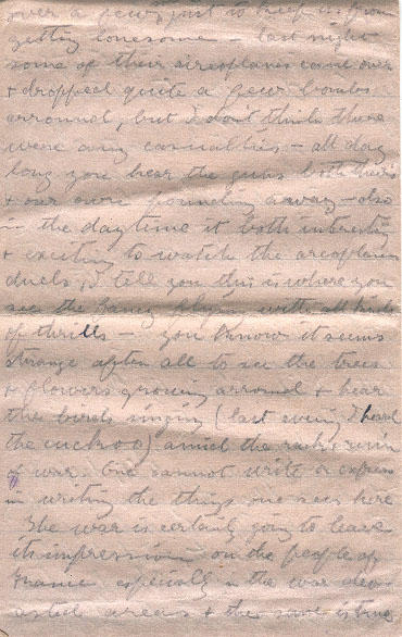 We are well within range of Fritz's guns & occasionally he sends over a few shells just to keep us from getting lonesome - last night some of their aireoplanes came over & dropped quite a few bombs arround, but I don't think there were any casualties - all day long you hear the guns both theirs & our own pounding away - also in the daytime it both interesting & exciting to watch the areoplane duels, I tell you this is where you see the fancy flying with all kinds of thrills - you know it seems strange after all to see the trees & flowers growing arround & hear the birds singing (last evening I heard the cuckoo) amid the rack & ruin of war. One cannot write or express in writing the things one sees here.