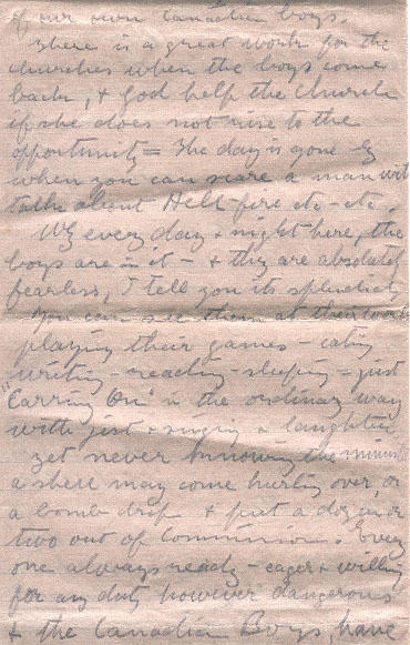 There is a great work for the Churches when the boys come back, & God help the Church if she does not rise to the opportunity = The day is gone by when you can scare a man with talk about Hell-fire etc-etc.Why every day & night here, the boys are in it - & they are absolutely fearless, I tell you its splendid, You can see them at their work playing their games - [?] - writing - reading - sleeping = just "Carrying On" in the ordinary way with jest & singing & laughter yet never knowing the minute a shell may come hurling over, or a bomb drop & put a dozen of two out of commission. Everyone always ready - eager & willing for any duty however dangerous & the Canadian Boys, have won the name of being the best in the whole line. I got my first mail sence leaving Blighty last evening, there was two letters from you 22 & 23 & pix from England