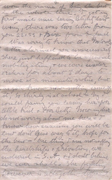 Was sorry to know that McCord letter alarmed you unnecessarily. There just happened to be a general mobilization, & we were under orders for about 3 days to move at a minutes notice, but as you know now nothing came of it, So Shirley is at school = My I could fancy you leaving her = poor little kid & Poor Betty. Now my dear do not worry about me here = I know how anxious you will be but don't give way to it, hope for the best - One thing I am not suffering the hardships & privations, we endured in S.A. & I don't believe we ever shall. The fighting however is altogether different And & as far as the danger etc is concerned - well a man hardly gives it a thought = "The cuckoo is is singing as I write" & so you must take its message as being the harbinger of the Spring of Peace.