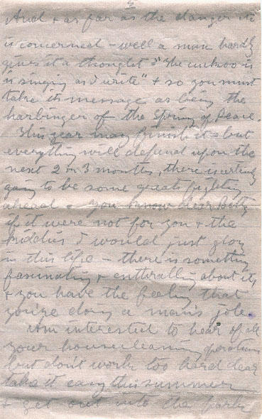 This year may finish it = but everything will depend upon the next 2 or 3 months, there is certainly going to be some great fighting ahead. You know dear Betty if it were not for you & the kiddies I would just glory in this life - there is something fasinating & enthralling about it, & you have the feeling that you're doing a man's job.