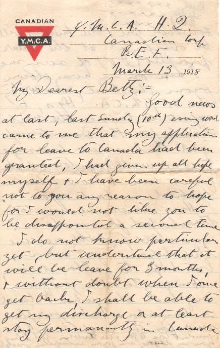 Good news at last, last Sunday (10th) evening word came to me that my application for leave to Canada had been granted, I had given up all hope myself & I have been careful not to give any reason to hope for I would not like you to be disappointed a second time.