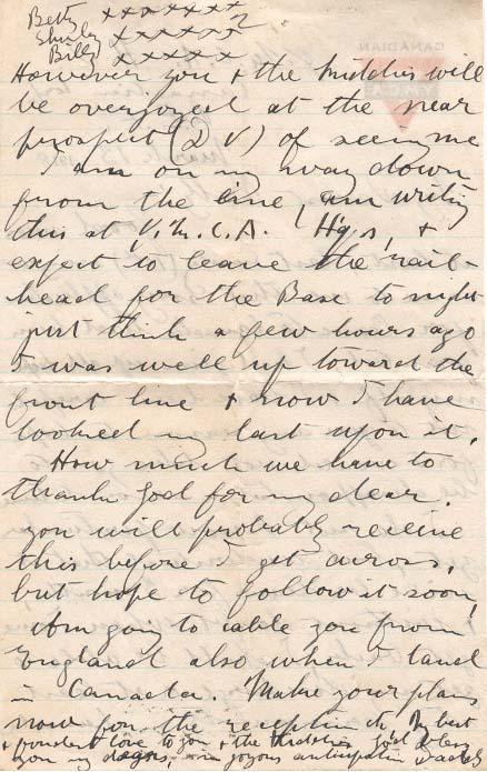 I Am on my way down from the line, am writing this at Y.M.C.A. Hqs & expect to leave the railhead for the Base tonight just think a few hours ago I was well up toward the front line & now I have looked my last upon it.