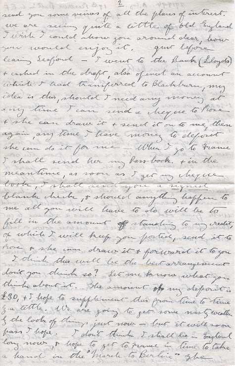 Late I hope to visit the village - the old Smithy & church with its "God's acre", also the cottage where dwelt the Village Blacksmith. I must also try & send you some views of all the places of interest. We are seeing quite a little of Old England I wish I could show you around dear, how you would enjoy it. Just before leaving Seaford - I went to the Bank (Lloyds) & cashed in the draft, also opened an account which I had transferred to Blackburn, my idea is this, should I need any money at any time I can send a cheque to Rose & she can draw it & send it on to me, then again, any time I have money to deposit she can do it for me - When I go to France I shall send her my Pass-book & in the meantime, as soon as I get my cheque book, I shall send you a signed blank check, & should anything happen to me all you will have to do will be to fill in the amount standing to my credit of which I will keep you posted, send it to Rose & she can draw it & forward it to you.