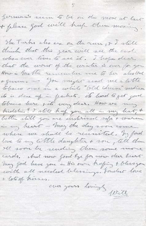 The Turks also are on the run, & I still think that this year will see the end who-ever lives to see it. I hope dear that the worst of the winter is over for you. How is Mattie remember to her also Hal & Gunns - You might send a little tobacco once in a while "Old Chum" medium it is done up in packets, its hard to get good tobacco here & it is very dear. How are my kiddies? I still keep you all in my hat, & better still you are enshrined safe & warm in my heart - May the day soon come when we shall be reunited. My fond love to my little daughter & son, tell them I'll soon be sending them some more cards. And now Good-Bye for now dear heart May God have you in His own keeping & bless you with all needed blessing. Fondest love & lots of kisses.