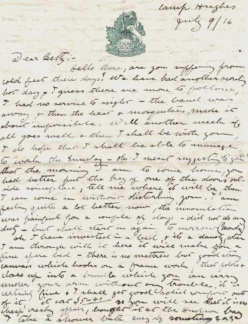Oh I have invested in a bed, & it's a dandy, when I am through with it here it will make you a fine spare bed - there is no mattress but good strong canvas which hooks on a frame work, that folds & closes up into a bundle which you can carry under your arm without any trouble. it is certainly fine & I shall get good solid comfort out of it, it cost $5-40 so you will see that it is [?] cheap [?] affair, bought it at the Hudson bay I take a shower bath every day sometimes 2 or 3 but still when I come home I shall appreciate a good soft water bath, so be prepared, as to food so far as I am concerned don't go to any extra trouble cooking etc - we'll have a nice easy time to-gether, get timed or cooked stuff, fruit etc.