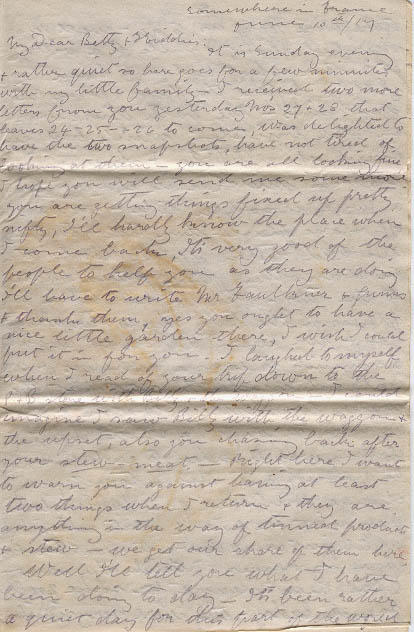 It is Sunday evening & rather quiet so here goes for a few minutes with my little family - I received two more letters from you yesterday No's 27 & 28 that leaves 24-25-&26 to come, Was delighted to have the two snapshots, have not tired of looking at them - you are all looking fine I hope you will send me some more you are getting things fixed up pretty nifty, I'll hardly know the place when I come back, It's very good of the people to help you as they are doing I'll have to write Mr Faulkner & Gunns & thank them, yes you ought to have a nice little garden there, I wish I could put it in for you. I laughed to myself when I read of your trip down to the P & B store with Billy & the waggon - I could imagine I saw Billy with the waggon & the upset, also you chasing back after your stew-meat - Right there I want to warn you against having at least two things when I return & they are anything in the way of [?] & stew - we get our share of them here.