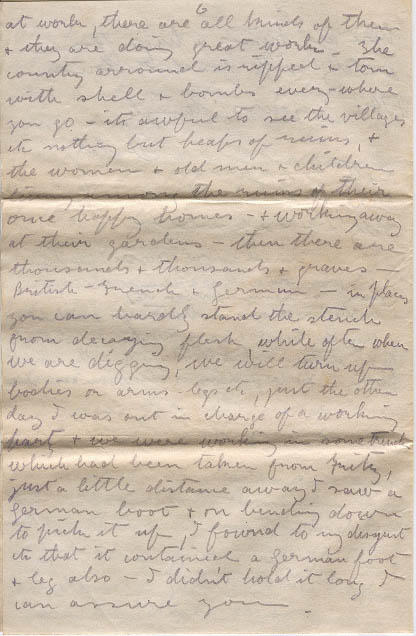 I wish you could see the areoplanes at work, there are all kinds of them & they are doing great work - The country arround is ripped & torn with shell & bombs every-where you go - its awful to see the villages etc nothing but heaps of ruins, & the women & old men & children living among the ruins of their once happy home -& working away at their gardens - then there are thousands & thousands & graves - British - French & German - in places you can hardly stand the stench from decaying flesh, while often when we are digging, we will turn up bodies or arms - legs etc, just the other day I was out in charge of a working party & we were working in some trench which had been taken from Fritz, just a little distance away I saw a German boot & on bending down to pick it up, I found to my disgust etc that it contained a German foot & leg also - I didn't hold it long I can assure you.
