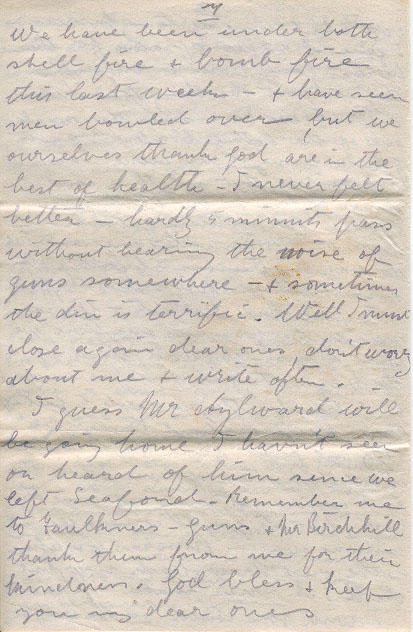 We have been under both shell fire & bomb fire this last week - & have seen men bowled over, but we ourselves thank God are in the best of health - I never felt better - hardly 5 minutes pass without hearing the noise of guns somewhere -& sometimes the din in terrific. Well I must close again dear ones, don't worry about me & write often.