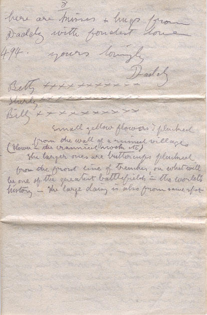 I guess Mr Aylward well be going home I havn't seem or heard of him sence we left Seaford. Remember me to Faulkners - Gunns & Mr Birchhill thank them from me for their kindness. God bless & keep you my dear ones here are kisses & hugs from Daddy with fondest love 494.