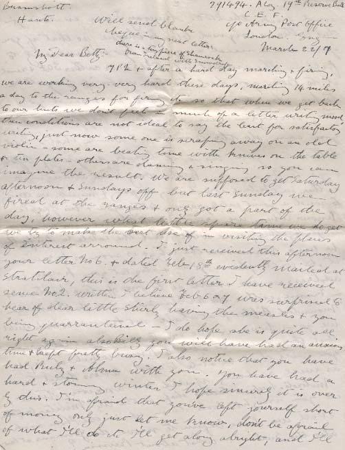 7 P.M & after a hard day marching & firing, we are working very - very hard these days, marching 14 miles a day to the ranges for firing etc. so that when we get back to our huts we don't feel in much of a letter writing moon then conditions are not ideal to day the least for satisfactory writing, just now some one is scraping away on an old violin - some are beating time with knives on the table or tin plates - others are dancing & singing so you cam imagine the result. We are supposed to get Saturday afternoon & Sundays off but last Sunday we fired at the ranges & only got a part of the day; however what little spare time we do get we try to make the best use of in visiting the places of interest arround. I just received this afternoon your letter No 6. & dated Feb 18th evidently mailed at Stratclair, this is the first letter I have received sence No. 2. written I believe Feb 6 or 7 was surprised to hear of dear little Shirley having the measles & you being quarranteened - I do hope she is quite all right again also Billy you will have had an anxious time & kept pretty busy. I also notice that you have had Ruby & Alma with you. You have had a hard & strong winter I hope sincerely it is over by this. I'm afraid that you've left yourself short of money only just let me know, don't be afraid of what I'll do etc I'll get along alright, and I'll send back the $150. Anyway I am enclosing in this letter a signed blank cheque so that if you you are in need anytime you have only to fill in the amount up to $150 or rather 30£ & send it to Rose, you had better make it payable to her also, & she will cash it & send you the money or in case anything happens to me you can do the same. I think that I had better let you have it back anyway before I go to France. By the way I am arranging or rather Serg't McCord a friend in my company & myself are arranging to send a joint cablegram, letting you & his people know when we cross over to France, we are expecting to go together, & we will send the cable to his father he has a business in the city, & as soon as he receives it, he will phone you & also let you know our address - we shall go to one of two battalions in France, either the 46th Canadians of the 1st Canadian Mounted Rifles, but shall not know which until we go - however we are to so word our cablegram that they will be able to know which it is & you will then be able to send letters directly to me as well as being spared an anxious time.