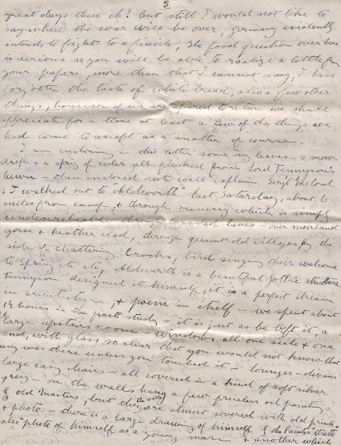 I am enclosing in this letter some ivy leaves - a snow-drop & a sprig of cedar all plucked from Lord Tennyson's lawn - then enclosed note will explain. Serg't McCord & I walked out to "Aldworth" last Saturday, about 6 miles from Camp, & through scenery which is simply undescribeable through wooded lanes - over moorland gorse & heather clad, through quaint old villages, By the side of chattering brooks, birds singing their welcome to spring etc etc, Aldworth is a beautiful Gothic structure Tennyson designed it himself, it is a perfect dream in architecture, & poem in itself - we spent about 1 ½ hours in the poets study - it is just as he left it, a large upstairs room - windows all one side & one end, with glass so clear that you would not know that any was there unless you touched it - lounges - divans - large easy chairs - all covered in a kind of soft silver grey - on the walls hang a few priceless oil paintings by old Masters, but they the walls are almost covered with old prints & photos - there is a large drawing of himself by the Painter "Watto" also a photo of himself as a young man & another which especially drew my attention, a photo of his friend "Arthur Hallam" - to whose memory he wrote "In Memoriam"