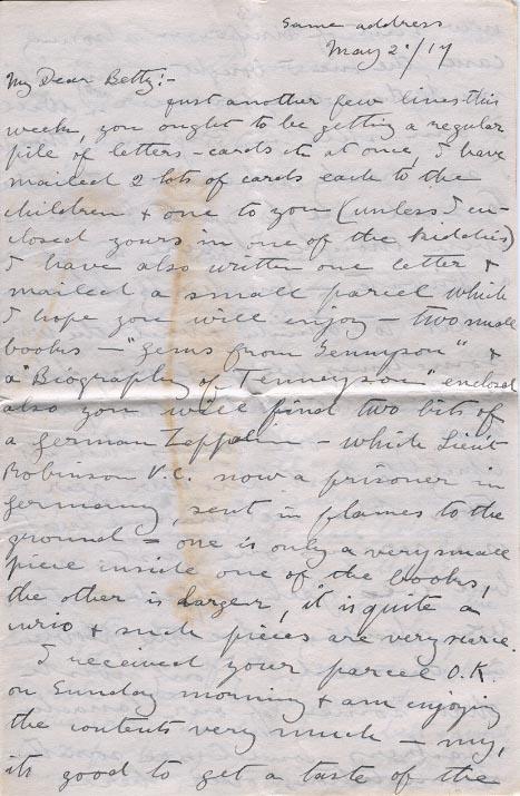 Just another few lines this week, you ought to be getting a regular pile of letters - cards etc at once, I have mailed 2 lots of cards each to the children & one to you (unless I enclosed yours in one of the kiddies) I have also written one letter & mailed a small parcel which I hope you will enjoy - two small books - "gems from Tennyson" & a "Biography of Tenneyson" enclosed also you will find two bits of German Zeppelin - which Lieut Robinson V.C. now a prisoner in Germany, sent in flames to the ground = one is only a very small piece inside one of the books, the other is larger, it is quite a curio & such pieces are very scarce.