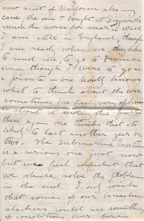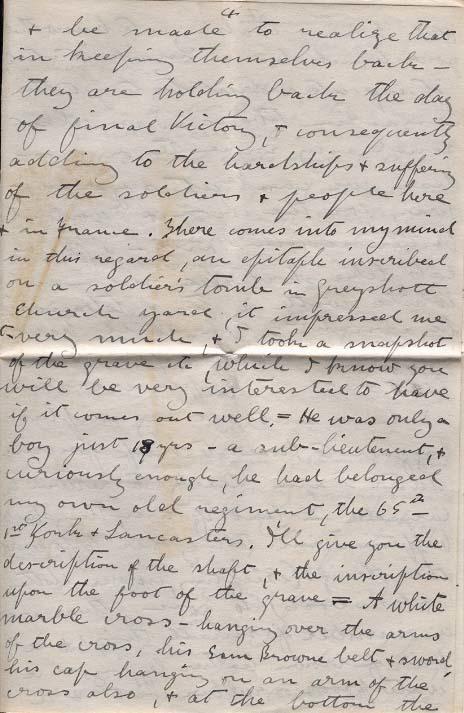 I have sent all my surplus baggage to Rose to keep for me until I am ready to return to Canada - but if anything should happen I am telling her to forward the things (excepting, under-clothing socks & boots) to you, there are a number of small things & a pair of brown leather leggings - a waterproof or rubber coat & a new suit of Uniform also my cane, the one I bought at Dingwall's much the worse for wear now. Well I am still in England, though I am ready whenever they like to send me, to go to France even though I were to go as a private - One hardly knows what to think about the war sometimes we feel very optimistic about it ending this fall then again one thinks that it is likely to last another year or two. The Submarine Question is a serious one just now but we feel confident that we shall solve the problem in the end. I only wish that some of our Canadian slackers could see something of conditions over here & be made to realize that in keeping themselves back - they are holding back the day of final victory, & consequently adding to the hardships & suffering of the soldiers & people here & in France. There comes into my mind in this regard, an epitaph inscribed on a soldier's tomb in Greyshott church yard, it impressed me very much, & I took a snapshot of the grave etc, which I know you will be very interested to have if it comes out well, = He was only a boy just 18 yrs - a sub-lieutenant, & curiously enough, he had belonged my own old regiment, the 65th 1st York & Lancasters. I'll give you the description of the shaft, & the inscription upon the foot of the grave = A white marble cross - hanging over the arms of he cross, his Sam Browne belt & sword, his cap hanging on one arm of the cross also, & at the bottom the crest of the old regiment. The inscription as follows.