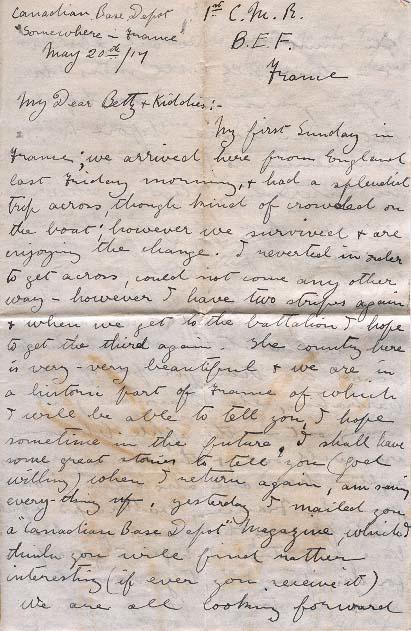 My first Sunday in France; we arrived here from England last Friday morning, & had a splendid trip across, though kind of crowded on the boat; however we survived & are enjoying the change. I reverted in order to get across, could not come any other way - however I have two stripes again & when we get to the battalion I hope to get the third again. The country here is very - very beautiful & we are in a historic part of France of which I will be able to tell you, I hope sometime in the future. I shall have some great stories to tell you (God willing) when I return again, am saving every-thing up. Yesterday I mailed you a "Canadian Base Depot" Magazine, which I think you will find rather interesting (if ever you receive it)
