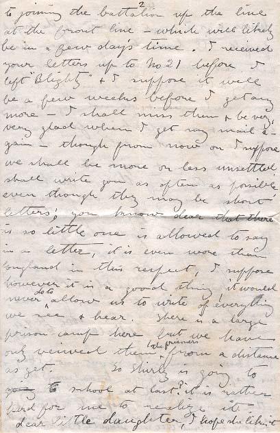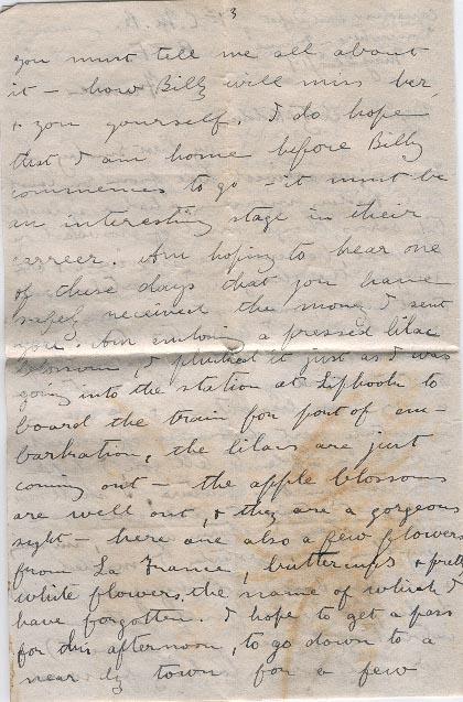 We are all looking forward to joining the battalion up the line at the front line - which will likely be in a few day's time. I received your letters up to No 21 before I left "Blighty" & I suppose it will be a few weeks before I get any more - I shall miss them & be very, very glad when I get my mail again - though from now on I suppose we shall be more or less unsettled shall write you as often as possible even though they may be short letters; you know dear that there is so little one is allowed to say in a letter, it is even more than England in this respect, I suppose however it is a good thing, it would never do to allow us to write everything we see & hear. There is a large prison camp here but we have only viewed them the prisoners from a distance as yet. So Shirley is going to school at last? It is rather hard for me to realize it dear little daughter, I hope she likes it you must tell me all about it - how Billy will miss her, & you yourself. I do hope that I am home before Billy commences to go - it must be an interesting stage in their carreer. Am hoping to hear one of these days that you have safely received the money I sent you. Am enclosing a pressed lilac blossom, I plucked it just as I was going into the station at Lipbook to board the train for port of embarkation, the lilacs are just coming out - the apple blossoms are well out, & they are a gorgeous sight - here are also a few flowers from La France, buttercups & pretty white flowers, the name of which I have forgotten. I hope to get a pass for this afternoon, to go down to a near by town for a few hours, & as I want to write to the English people I'll have to close, Again dearest Betty let me remind you not to worry about me - I am feeling very contented & do not regret having come - & am looking forward to the great day when we shall meet again & enjoy the supreme satisfaction together = the knowledge of having done our duty & made our sacrifice for the good of humanity. God bless you sweetheart, & grant unto you every needful blessing - kiss & hugs my dear kiddies for Daddy, & they will give you hugs & kisses for me.