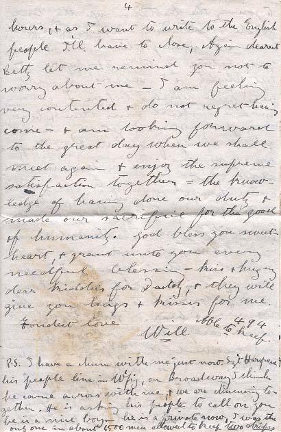 P.S. I have a chum with me just now. Sg't Hargrave his people live in Wp'g, on Broadway I think he came across with me, & we are chumming together. He is asking his people to call on you he is a nice boy - he is a private now, I was the only one in about 1,500 men to keep two stripes.