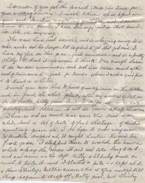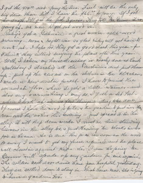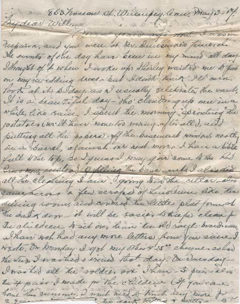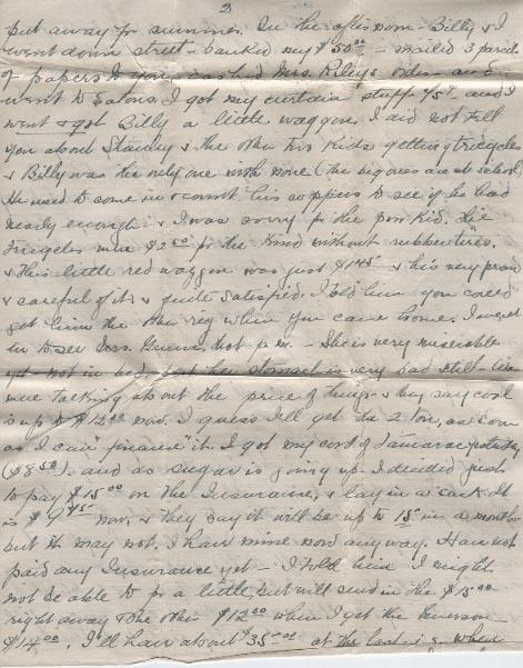 I have not had any more letters from you since wrote On Monday I got my other $25.ºº cheque so had the two. I washed & ironed that day - On Wednesday I washed all the "soldier sox" I have - 3 pairs also the 4 pair I made for the children ( If you came home this Summer I wont need to knit any more for 2 years or more) - all the dark takes & nutts[?] to put away For summer. In the afternoon - Billy & I went down street - banked my $50.ºº - mailed 3 parcel of papers to you - cashed Mrs. Rileys orders - and went to Eatons. I got my curtain stuff - [?]5¢ and I went & got Billy a little waggon. I did not tell you about Stanley & the other two kids getting tricycle & Billy was the only one with none (the big ones are at school He used the come in & count his coppers to see if you had nearly enough - & I was sorry for the poor kid. The tricycles were $2.50 for the kind without rubber tires. & His little red waggon was just $1.45 & he's very proud and careful of it & quite satisfied. I told him you could get him the rig when you came home. I was in to see Mrs. Gunn that p.m. - She is very miserable yet - not in bed, but her stomach is very bad still - We were talking about the price of things - & they say coal is up to $12.ºº now. I guess I'll get the 2 ton as soon as I can "finance" it. I got my cord of Tamarac yesterday ($8.50) and as sugar is going up I decided just to pay $15.ºº on the Insurance, & lay in a sack It is $9.45 now, & they say it will be up to 15 in a month but it may not. I have mine now any way. Have not paid any Insurance yet - I told him I might not be able to for a little, but will send in the $15.ºº right away & the other $12.ºº when I get the Emerson[?] $14.ºº, I'll have about $35.ºº at the last i.s. when I get the $14.ºº and pay the Ins. Fuel will be the only big item then till I have the $66.ºº to pay. If I get the draft I'll get the fuel I guess. They told Mr. Gunn its going up. So need to get out wood etc.