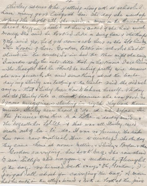 This Lover of hers. Gordon, talks in school & had to stand in the corner; So in bed the other night she says "I wonder why he acts like that for he knows I see him - she thought that he should be acting pretty nice because she was present. He said something about the teacher saying Shirley was talking & the teacher said she did not say so - that Shirley knew how to behave herself. Thursday she let Shirley take a drink, because she was good. So I guess Maggies is starting in right. They teach them music. Shirley never hear of "do - re - mi- before - In the firmies now there is a Lottie - a darkey maid - & The boy calls her Lol-tee - & that was all Shirley cared make out of la - ti - do. It was so Funny. The teacher has some raw material there to develop. The other day they came home at noon - Nellie, & Shirley & Gordon & she - Gordon carrying her book bag. She ran ahead to see Billy's new waggon. & suddenly Thought of the bag so turned back to say "Oh, Gordon I forgot all about you carrying the bag." A man had his auto, in the alley & turned & took a look at the pair.