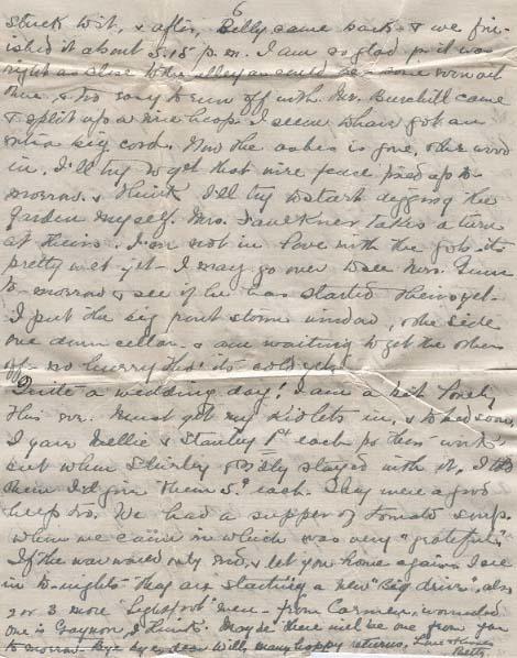Seems years ago now.- I was in Nepawa, and you were at Mr. Dicusecores's[?] Funeral. The events of the day have been in my mind all day I though of it when I woke up: Shirley wanted me to put on my wedding dress - but I didn't think I'll even have at it to-day. as I usually celebrate the event It is a beautiful day - tho: clouding up once in a while like rain. I spect the morning "sprouting" The potatoes (will have none too many after all) and putting all the papers off the basement window, neatly in a barrel, against our next move. I have a bible Full to the top, so I guess. I may give some to the Red Cross now, instead of filling the basement. I also did all the cleaning I am going to do the cellar. - also came across o few scraps of Linoleum like the dining room, and covered the little platform at the back den - it will be easier to keep clean for the children to sit on, then the old rough board were