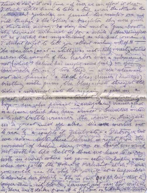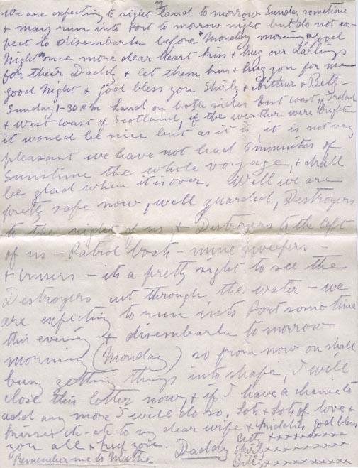 Sunday 1-30 P.M. Land on both sides East Coast of Ireland & West Coast of Scotland, if the weather were brighter it would be nice but as it is, it is not very pleasant we have not had 5 minutes of sunshine the whole voyage, & shall be glad when it is over. Well we are pretty safe now, well guarded, Destroyer to the right of us & Destroyer to the left of us - Patrol boats - mine sweepers - & cruisers - it's a pretty sight to see the Destroyers cut through the water - we are expecting to run into Port some time this evening & disembark to morrow morning (Monday) so from now on shall be busy getting things into shape, I will close this letter now &, if I have a chance to add any more I will do so. Lots & Lots of love & kisses etc - etc to my dear wife & kiddies God bless you all & keep you.