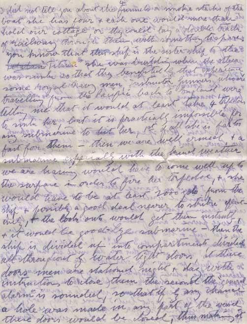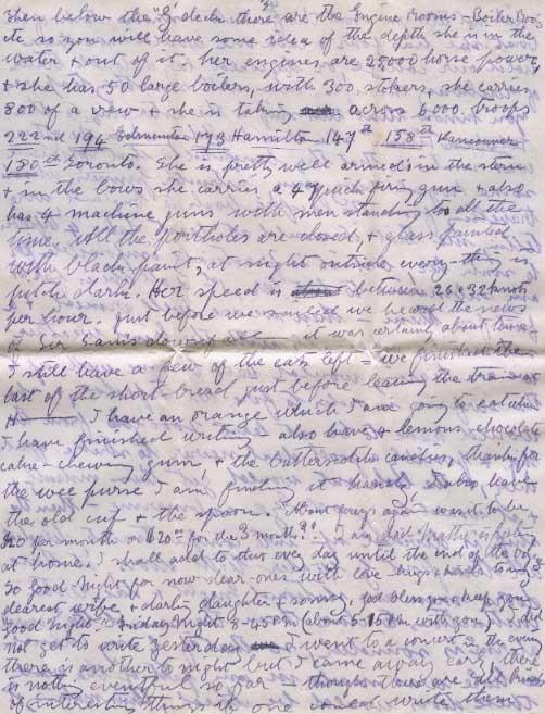 Well, we cast our moors at 3-45 P.M. Tuesday Nov 14, we were towed out into mid channel by about 6 large steam tugs then we steamed out under our own steam & have been going ever sence - she is certainly some goer we expect to run into Liverpool on Sunday afternoon or evening & disembark on Monday morning. A good many of the men are very sick to day the privates & corporals are packed pretty close - most of them are in hammocks = however their food is very good. I told you in my last letter about the luxurious quarters we had & I am going to enclose menu cards for today's meals so that you will have an idea of how we (the sergeants etc) are living we could not wish for anything better. I am feeling fine now & enjoying the voyage - have not been sea-sick at all = but that headache the first day was pretty bad, I had a good hot sea bath just before dinner today, & it was fine - if ever we can afford to dear I think we'll have to take a trip across the Atlantic together - eh? Yesterday we passed two vessels - one an oil tanker & the other a freighter they were quite a distance away. To day we met a gun-boat she hovered arround us for a while & then disappeared as quickly & as mysteriously as she had come. I almost forgot to tell you about sailing out of H_________ The weather, (as it is still,) was wet - chilly, & nasty, stretched across the mouth of the harbor was a submarine net (which I believe has caught some fish.) an opening was made for us by two tugs - as we streamed out we passed a third class cruiser (nameless) bristling with guns, the bluejackets thronged the sides & swarmed into the rigging, & gave us a great cheer which was returned with interest by our boys - we also passed an auxiliary ? cruiser (also nameless) that is a liner which has been armed & converted into a light battle cruiser the crew on this gave us a great send off also. We were escorted out to sea by a couple of gunboats & a Destroyer but we soon left these behind = right from the moment of sailing every man on board was served out with a life belt, & these we have to carry with us every-where we go - eating - sleeping & even when we go to the "House of Parliament" ah-ah. I wish you could see the ship for yourself it is impossible to describe her properly - she is over 900 ft long that is longer than a city block, I cannot just say how wide she is. There are 8 decks from A to S. (I am on C deck No10 stateroom. Then below the "G" deck there are the Engine rooms - Boiler Floor etc so you will have some idea of the depth she is in the water & out of it. her engines are 25,000 horse power & she had 50 large boilers, with 300 stokers, she carries 800 of a crew & she is taking across 6,000 troops 222nd 194 Edmonton 173 Hamilton 147th 158th Vancouver 180th Toronto. She is pretty well armed; in the stern & in the bows she carries a 4"7 quick firing gun & also had 4 machine guns with men standing to all the time. All the portholes are closed, & glass painted with black paint, at night outside every-thing is pitch dark. Her speed is between 26 & 32 knots per hour. Just before we sailed we heard the news of Sir Sam's downfall it was certainly about time. I still have a few of the eats left = we finished the last of the short=bread just before leaving the train at H________ I have an orange which I am going to eat when I have finished writing - also have 4 lemons - chocolate cake - chewing gum, & the butterscotch candies, thanks for the wee purse I am finding it handy, I also have the old nif & the spoon. "About Greys again was it to be $20 per month or $20.00 for the 3 months?" I am glad Mattie is feeling at home & I shall add to that every day until the end of the voyage so Good Night for now dear ones with love - hugs & more to my dearest wife & darling daughter & sonny, God bless you & keep you "Good night." Friday Night 8-45 P.M. (about 5-15 P.M. with you) I did not get to write yesterday I went to a concert in the evening there is another to night but I came away early, there is nothing eventful so far - though there are all kinds of interesting things if one could write them. I did not tell you about the funnels or smoke stacks of the boat she has four & each one would more than hold our cottage, or they could lay a double track of railway through them with something to spare you know that this ship is the sister ship to the "Titanic" she was building when the other was sink so that they benefited by that experience some Royal Navy men, Instructor Gunners who are travelling from the Pacific back to England were telling me that it would at least take 4 torpedoes to sink her, but it is practically impossible for any submarine to hit her, 1st of all she is far too fast for them - then we are well armed, & a submarine especially with the kind of weather we are having would have to come well up to the surface in order to fire her torpedoes, & she would have to be at least 2000 yds from the ship & possibly a good deal nearer to strike effectively, & the look outs would get them instantly & it would be good-bye submarine - then the ship is divided up into compartments, divided all throughout by water-tight doors, at these doors men are stationed night & day with instructions to close them the second the "general alarm" is sounded, so that if by any chance a hole was made in any part of the vessel these doors would be closed, thus making it impossible for the water to come into any other part of the boat, & confining it to the compartment or section struck. The water tight doors are also closed my electricity & again are self closing - then she has 3 bottoms, where the Titanic only had two, but I guess you will not be interested in all this detail, I might say however that she was launched in 1913. I spoke of the "General Alarm" sounding I might explain that at the "general alarm" every man on board had to double up to the deck at once & "Fall in" at the allotted place - The officers & members of the crew all take up their d