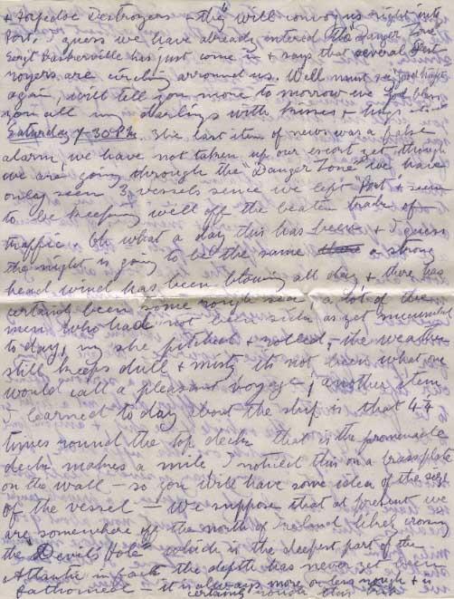 Saturday 7-30 P.M. The last item of news was a false alarm, we have not taken up our escorts yet though we are going through the "Danger Zone" we have only seen 3 vessels sence we left "Port" & seem to be keeping well off the beaten track of traffic. Oh what a day this had been & I guess that night is going to be the same a strong head wind had been blowing all day, & there had certainly bee some rough sea, a lot of the men who had not been sick as yet succumbed to day, my she pitched & rolled, - the weather still keeps dull & misty, its not been what one would call a pleasant voyage; another item I learned to day about the ship is that 4 ¼ times round the top deck that is the promenade deck makes a mile, I noticed this on a brass plaque on the wall - so you will have some idea of the size of the vessel - We suppose that at present we are somewhere off the north of Ireland likely crossing the "Devil's Hole" which is the deepest part of the Atlantic in fact the depth has never yet been fathomed - it is always more or less rough & is certainly rough this trip. We are expecting to sight land to morrow Sunday sometime & may run into Port to morrow night but do not expect to disembark before "Monday morning", "Good Night" once more dear heart kiss & hug out darlings for their Daddy & let them kiss & hug you for me Good Night & God bless you Shirley & Arthur & Betty.